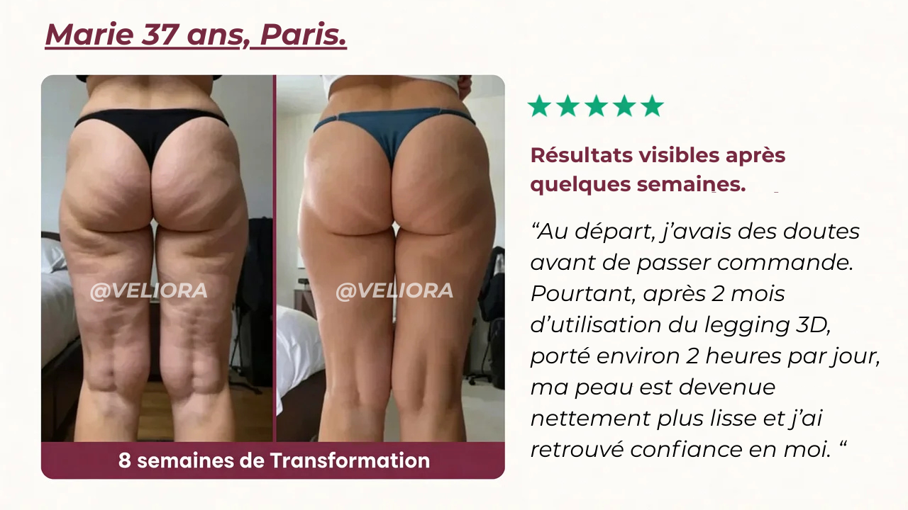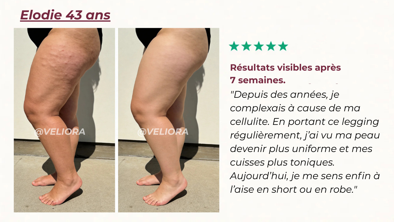 Crèmes, massages, soins en institut...et malgré tout, les résultats restent décevants. C’est pour cette raison que nous avons créé le legging 3D drainant anti-cellulite Veliora.